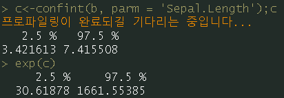 즉, Sepal.Length가 한 단위 증가함에 따라 Y=2의 오즈가 exp(5.140)≒170배 증가함을 알 수 있다.